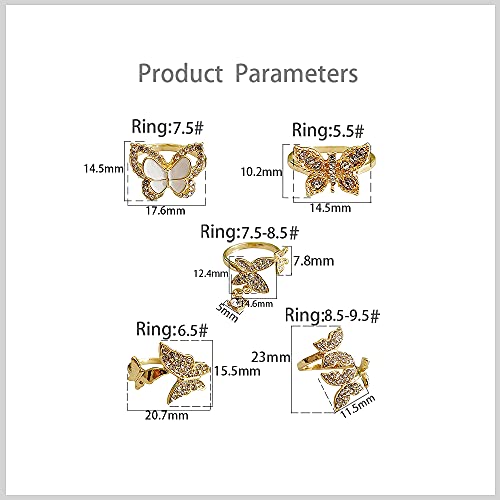 5 Pcs Butterfly Statement Rings Set for Women Girls Wedding Promise Engagement Cubic Zirconia Gold Plated Open Band Knuckle Rings Comfort Fit Fashion Christmas Birthday Jewelry Gifts 4