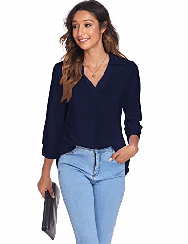Newchoice Womens Collared V Neck 3/4 Sleeve Shirts Business Casual Tops Loose Work Blouses (S-3XL) 3