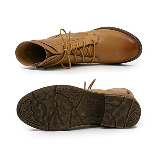 Mona flying Women's Combat Boots Mid Calf Side Zipper Fashion Lace up Soft Leather Booties Low Heel 5