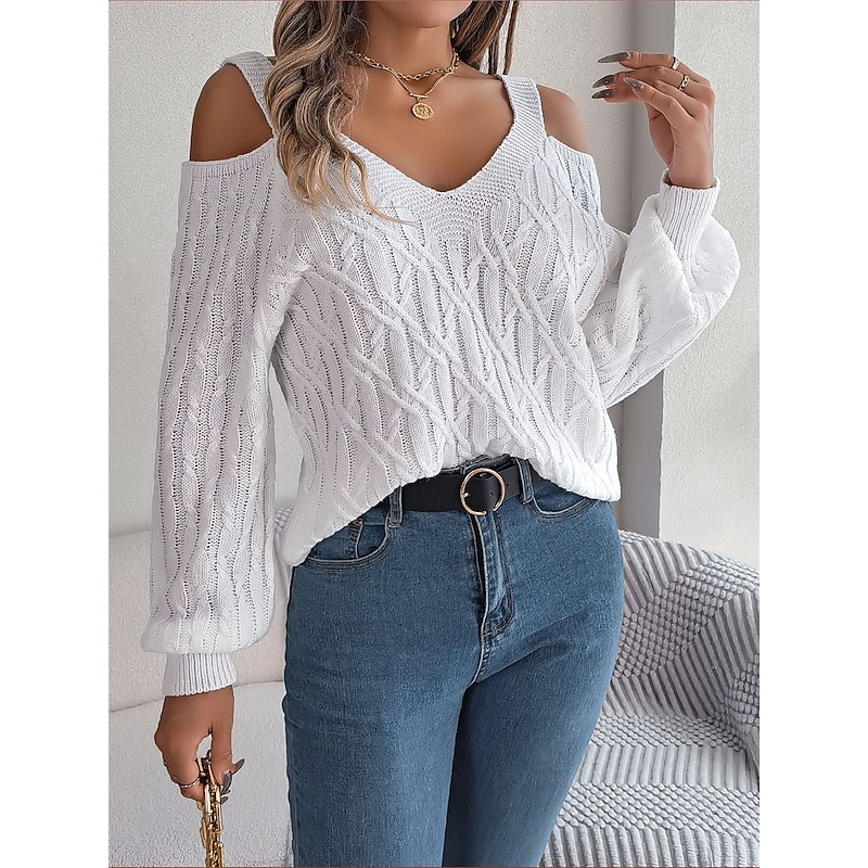 Highlights [Fabric:] Crafted from high-quality acrylic, this sweater ensures both comfort and warmth, with a soft texture and micro-elastic feel perfect for chilly fall and winter days. [Fit:] The sweater showcases a regular fit with a ribbed knit style that enhances the silhouette without compromising on comfort, making it a versatile piece that pairs effortlessly with any look. [Design Highlights:] Featuring a trendy cold shoulder and a flattering V-neckline, this sweater brings a modern twist to classic knitwear. The intricate cable knit pattern adds a textured charm, while the long sleeves and solid color options in White, Light Blue, and Khaki make it a standout piece. [Occasions:] Ideal for daily wear, outdoor adventures, or weekend relaxation, this sweater is perfect for adding a touch of style to casual outings or cozy indoor settings. [Size Range:] Available in sizes S, M, and L, catering to a variety of body types, ensuring a comfortable and flattering fit for everyone.