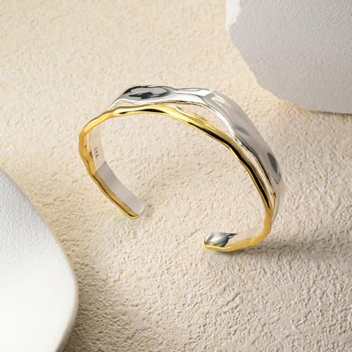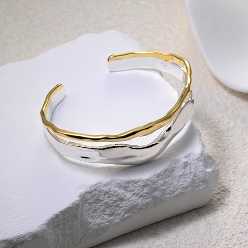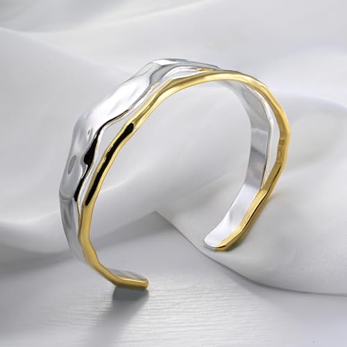 More information about Chunky Gold and Silver Cuff Bracelets Sterling Silver Two Tone Open Bangles Double Layer Irregular Wave Hammered Texture Bracelet for Women
