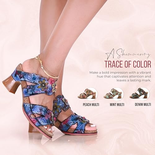 • 𝐒𝐓𝐘𝐋𝐈𝐒𝐇 𝐃𝐄𝐒𝐈𝐆𝐍 𝐀𝐍𝐃 𝐄𝐋𝐄𝐆𝐀𝐍𝐂𝐄: The floral hand-painted leather upper adds a unique artistic flair, making each pair a statement piece. Antique brass embellishments enhance the vintage look, while the open-toe silhouette offers breathability and a fresh summer vibe. The stylish, curvy stacked heel adds subtle height and an elegant profile without sacrificing stability.