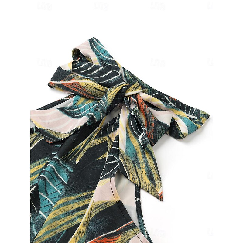 Highlights [Fabric and Fit] This women's halter crisscross tank is crafted from lightweight satin, offering a luxurious yet breathable feel perfect for spring and summer. The loose fit design ensures comfort without compromising style, making it a versatile addition to any wardrobe. [Design Features] The vibrant tropical leaf print in shades of grass green makes this top a standout piece. The elegant halter neck and crisscross backless design add a chic, sophisticated touch. A stylish bow detail further elevates the overall aesthetic, providing a unique look that's both modern and elegant. [Occasions] Ideal for casual outings, beach trips, and relaxed gatherings, this top complements a variety of laid-back occasions. Whether you're going to a beach party or enjoying a leisurely weekend outing, this piece combines practicality with style, ensuring you always look effortlessly chic. [Versatility and Styling] Pair this sleeveless top effortlessly with denim shorts or jeans for a casual beach-ready ensemble. Its relaxed silhouette makes it easy to wear, while the eye-catching print ensures you'll stand out in any crowd. [Size Range] Available in a range of sizes from S to 2XL, this top offers options to suit various body types, ensuring a suitable fit for everyone seeking style and comfort during the warmer months.