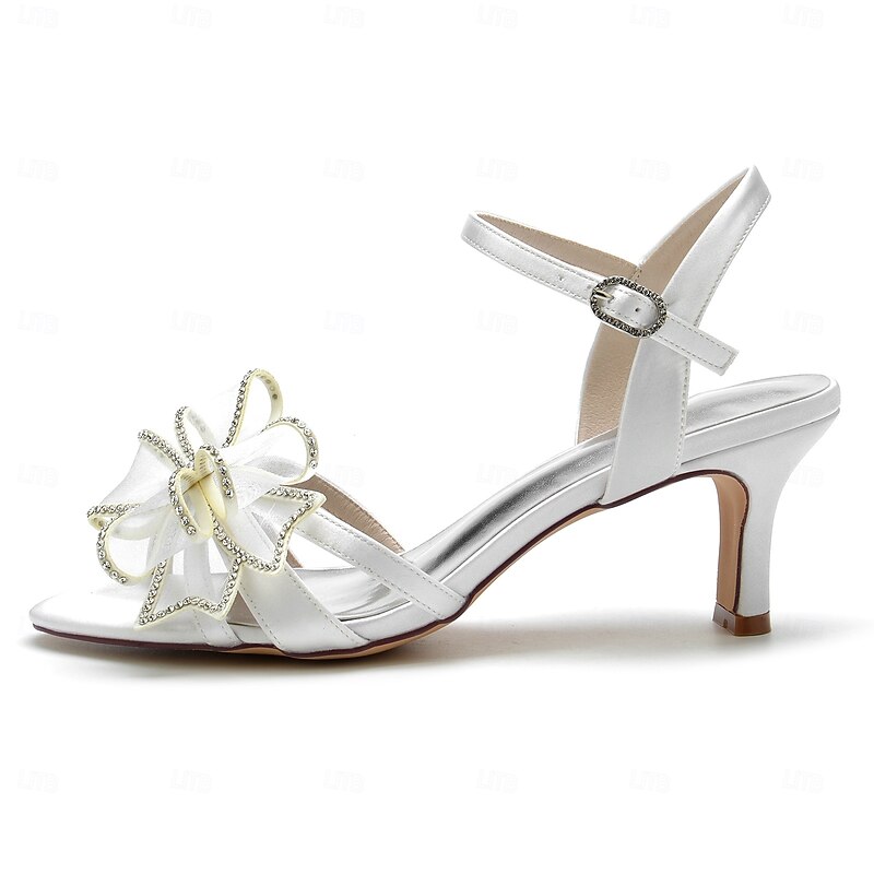 HOT ! Luxury Bridal Kitten Heel Sandals with Rhinestone Bow Detail – Beige Wedding Heels with Adjustable Straps