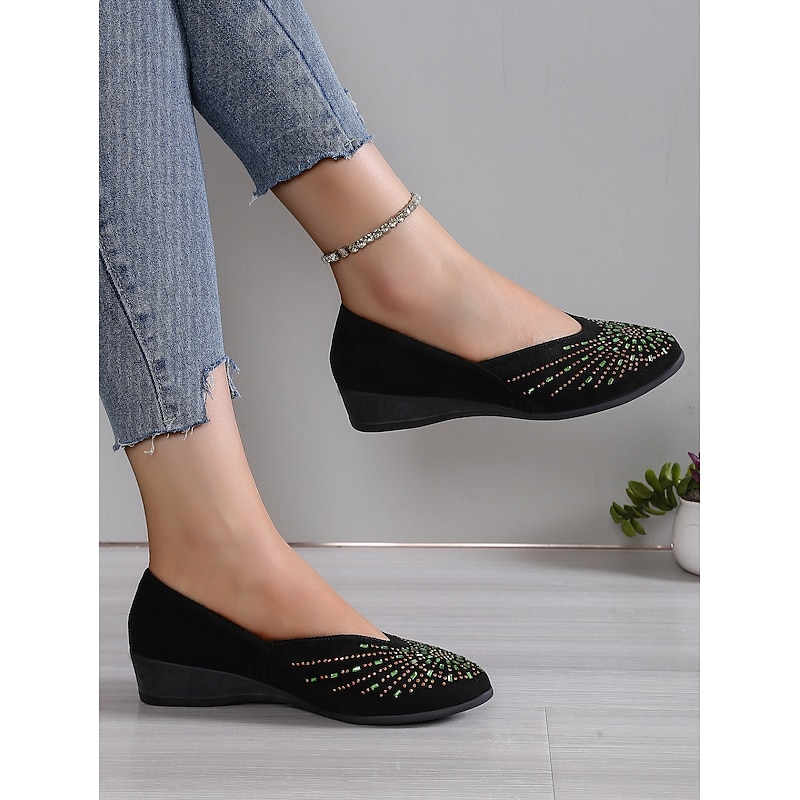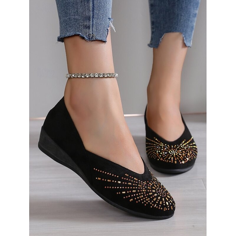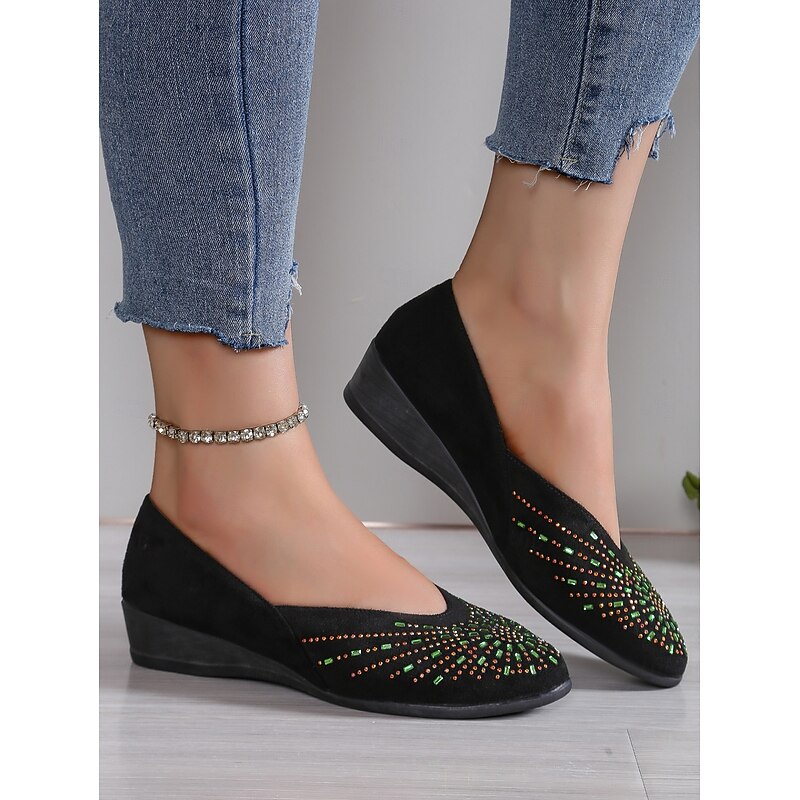HOT ! Black Faux Suede Flat Shoes for Women – Comfortable Slip-On Flats with Rhinestone Detailing, Trendy Casual Footwear