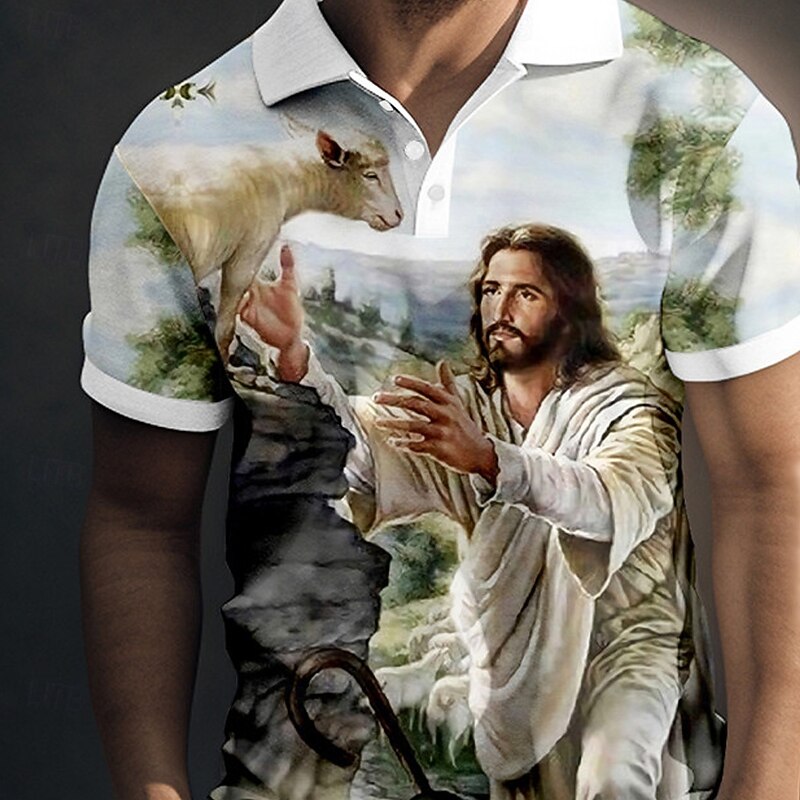 Men's Jesus Christian Polo Shirts Golf Shirt Short Sleeve Polo Shirts Collared Shirts Vintage Casual Vacation Wear Festival Wear Party Outfits Buttons 3D Print Yellow Blue Green 13