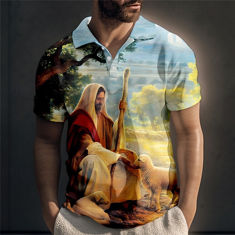 Men's Jesus Christian Polo Shirts Golf Shirt Short Sleeve Polo Shirts Collared Shirts Vintage Casual Vacation Wear Festival Wear Party Outfits Buttons 3D Print Yellow Blue Green 11