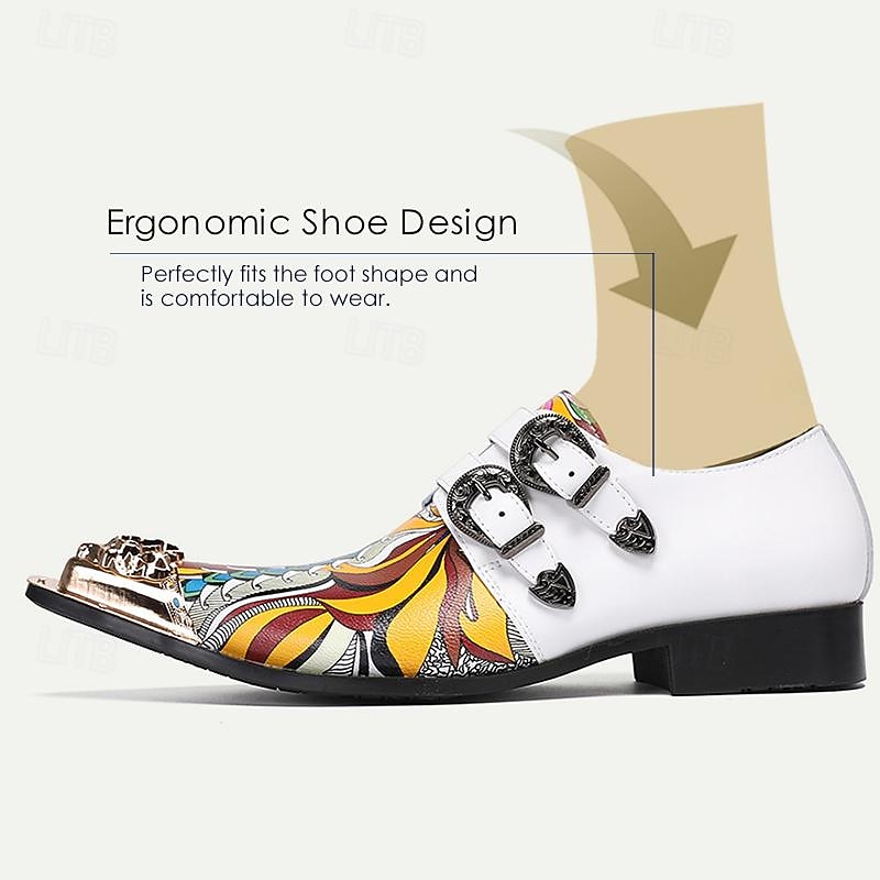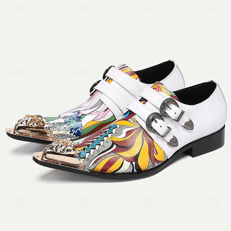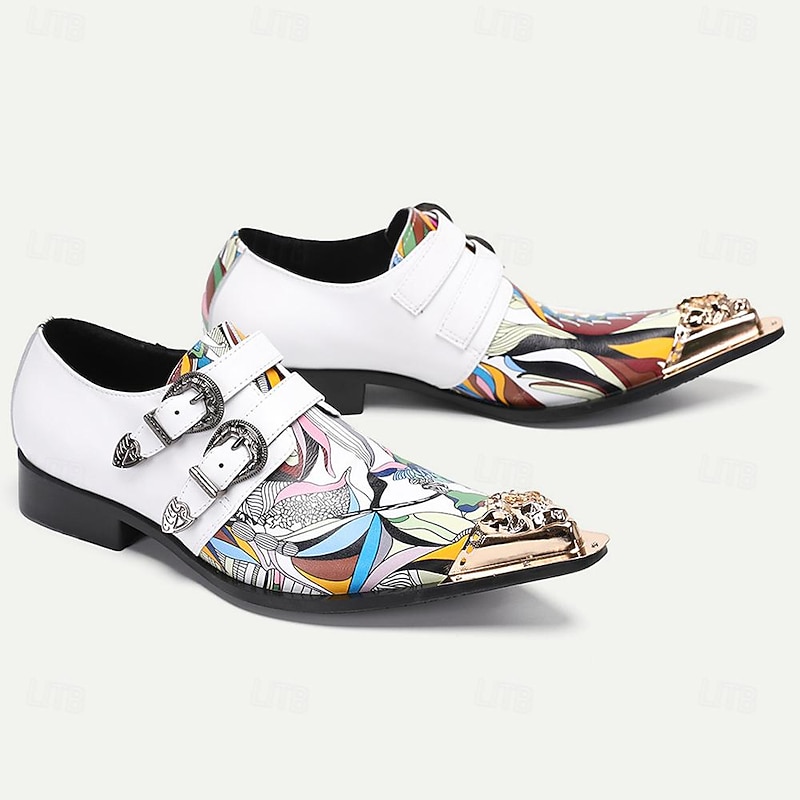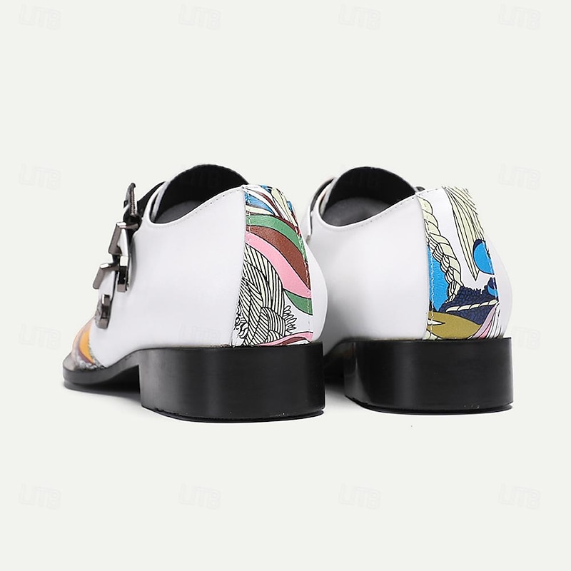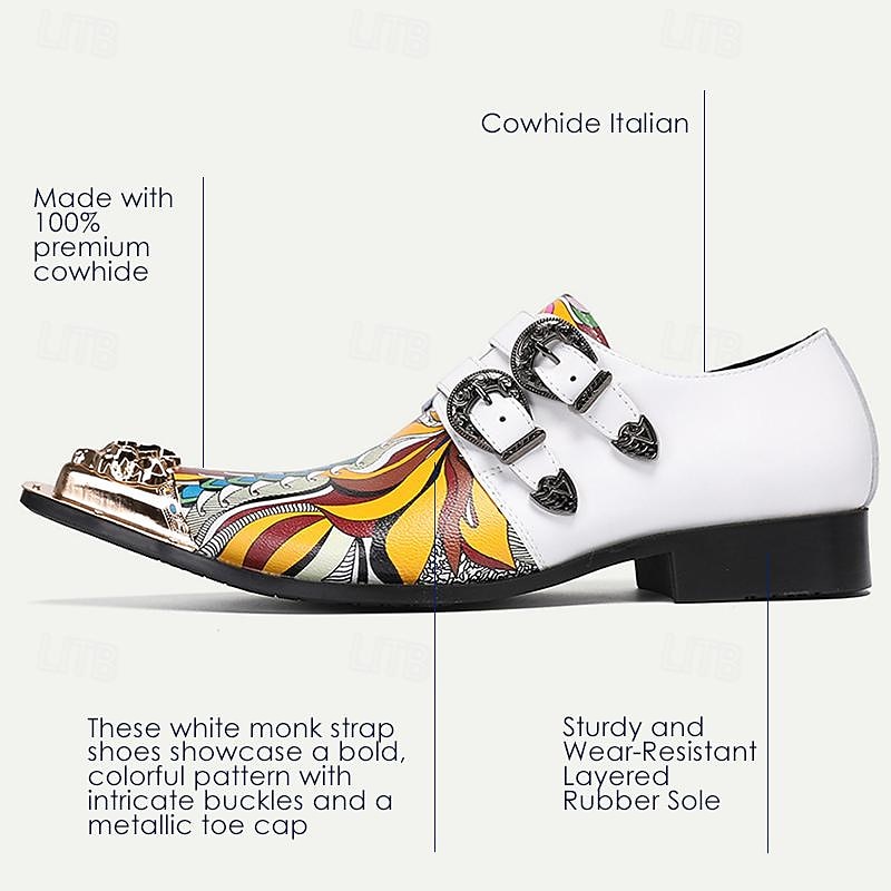 Highlights [Materials] : Crafted from Italian full-grain cowhide leather paired with a cowhide lining, these men's dress shoes offer a combination of high durability and comfort. The premium material ensures a top-notch quality, suitable for long-term wear. [Silhouette] : The shoes feature a classic monk strap design enhanced by a pointed toe shape. This timeless silhouette adds a formal and refined touch, ensuring you make an impression at any occasion. [Design Highlights] : These shoes stand out with their bold multicolored artistic pattern and polka dot color block. The design is accentuated by two decorative metal buckles and a metallic toe embellishment, showcasing intricate detailing for a luxurious and modern edge. [Occasions] : Perfect for both formal events and more casual gatherings, these shoes add a unique flair to any outfit. Whether attending a business meeting or a social event, their contemporary look makes a striking fashion statement. [Size Range] : Available in a wide range of sizes, from US5/EU38/UK4 to US13/EU46/UK12, these shoes cater to various foot sizes, ensuring a comfortable fit for all wearers.