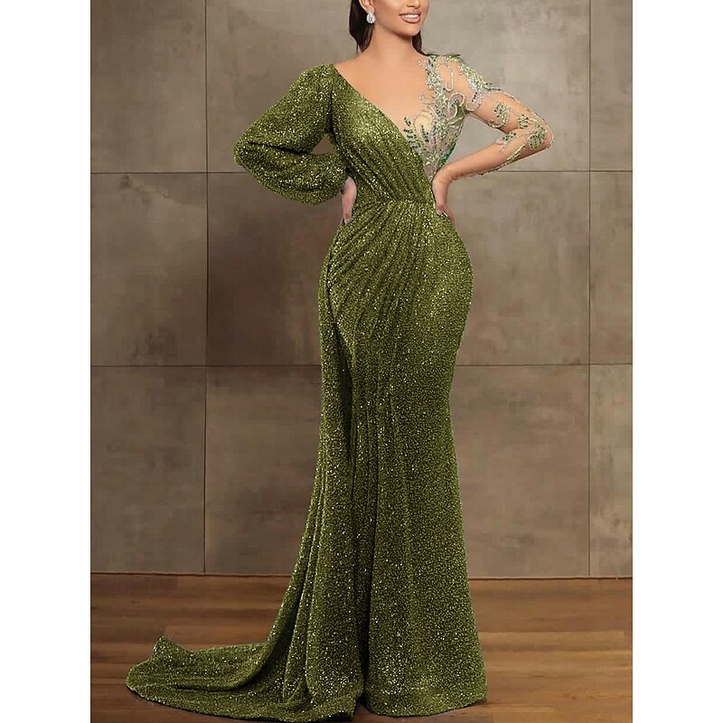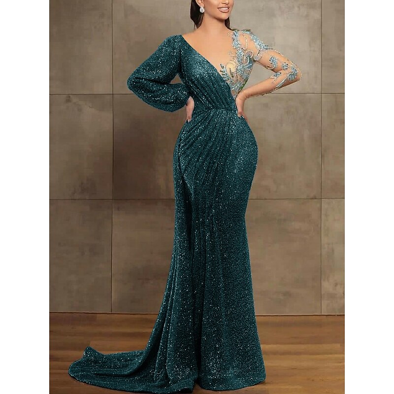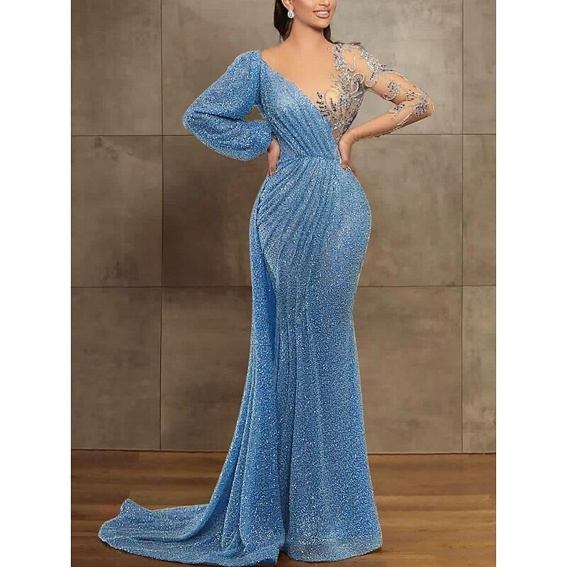 More information about Mermaid Sequin Evening Gown Elegant Dress Formal Court Train Long Sleeve Illusion Neck with Pleats Masquerade Dress