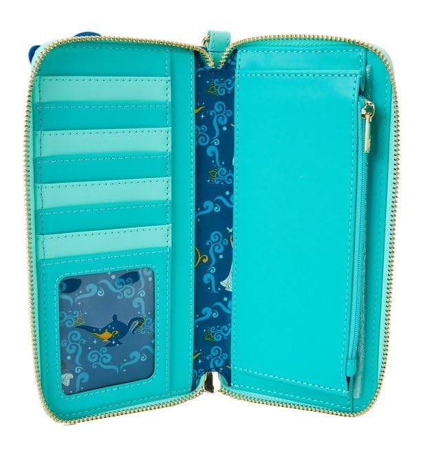 • The Loungefly Disney Princess Jasmine Wristlet Wallet is made of vegan leather (polyurethane). Wallet zips closed with shiny gold-colored metal hardware, and the wristlet strap is detachable. Additional features include applique, debossed, lenticular, and printed details. Take note of the coordinating inside lining. This wallet is an officially licensed Disney product.