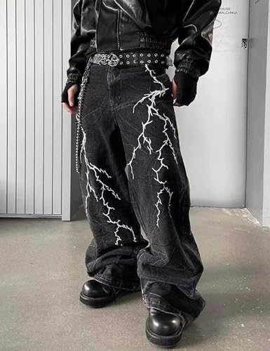 • Features:graphic pants men,Lightning Crack Denim Jeans,grunge jeans,loose fit jeans,wide leg jeans,hip hop pants,vintage pants,oversized jeans,mens grunge pants,mens trousers,skater jeans,embroidered jeans