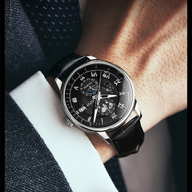 HOT ! Mechanical Watch for Men Business Luxury Analog Wristwatch CalendarAutomatic Self-winding Moon Phase Waterproof Noctilucent Genuine Leather Watch Gift