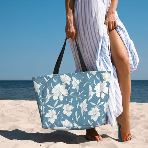 Lilies Flowers Light Blue Large Beach Bag Waterproof Sandproof Swim Tote Pool Bag For Women With Zipper 5