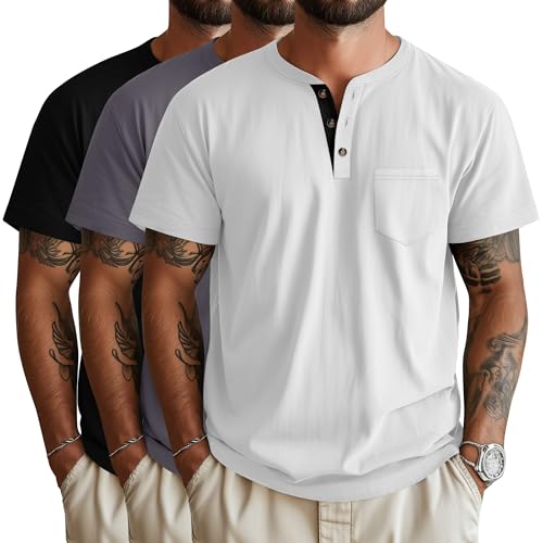 HOT ! Riyiper 3 Pack Men's Henley T-Shirts Short Sleeve Pocket Cotton Classic Tops Casual Basic Tees with Button Summer Trendy