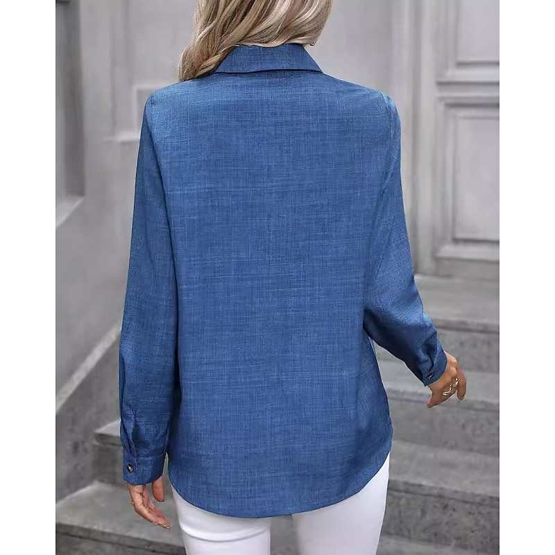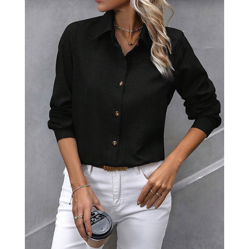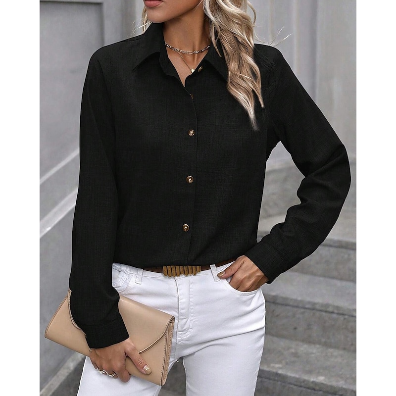 Highlights [Fabric]: Crafted from high-quality polyester, this stylish women’s blouse offers a soft and comfortable feel, perfect for all-day wear during spring, fall, and winter. [Fit]: The blouse features a form-fitting design that offers a flattering silhouette without compromising on comfort. Its regular-length cut makes it a versatile piece suitable for a variety of outfits. [Design Highlights]: The blouse showcases a classic shirt collar and a button-down front, combined with long sleeves for a timeless look. Its solid color pattern enhances its sleek, modern appeal, making it an ideal choice for both casual and formal settings. [Occasions]: Perfect for work and professional environments, this modern blouse is an excellent choice for day-to-night transitions. Pair it with white trousers for a crisp, polished ensemble. [Size Range]: Available in sizes S to XXL, accommodating a wide range of body types for a perfect fit.