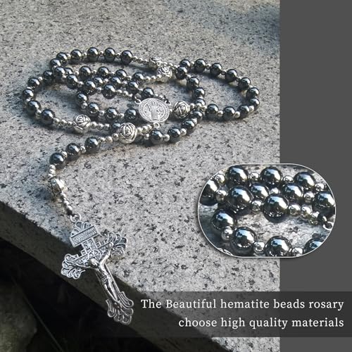 Hematite rosary beads catholic for men,Rosary Necklace for men and women with medal & cross,Rosary black stone beads with stainless steel beads and St.Benedict metal beads. 1