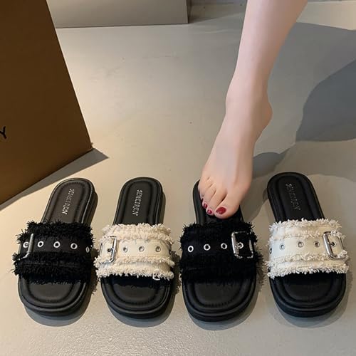 sought-after ! Women's Denim Tassel Buckle Decorated Cloud Platform Slides Sandals Retro Style Open-Toe Slip-On, Backless, Breathable and Non-Slip Bohemian Slippers