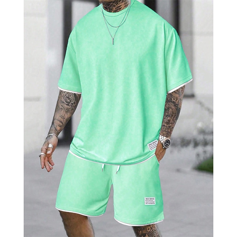 Men's Workout Set Tracksuit T shirt & Shorts Set Outfit Set Crew Neck Outdoor Daily Sports Pocket Drawstring 2 Piece Plain Light Green Pink Red Polyester Activewear Classic Casual Summer 15