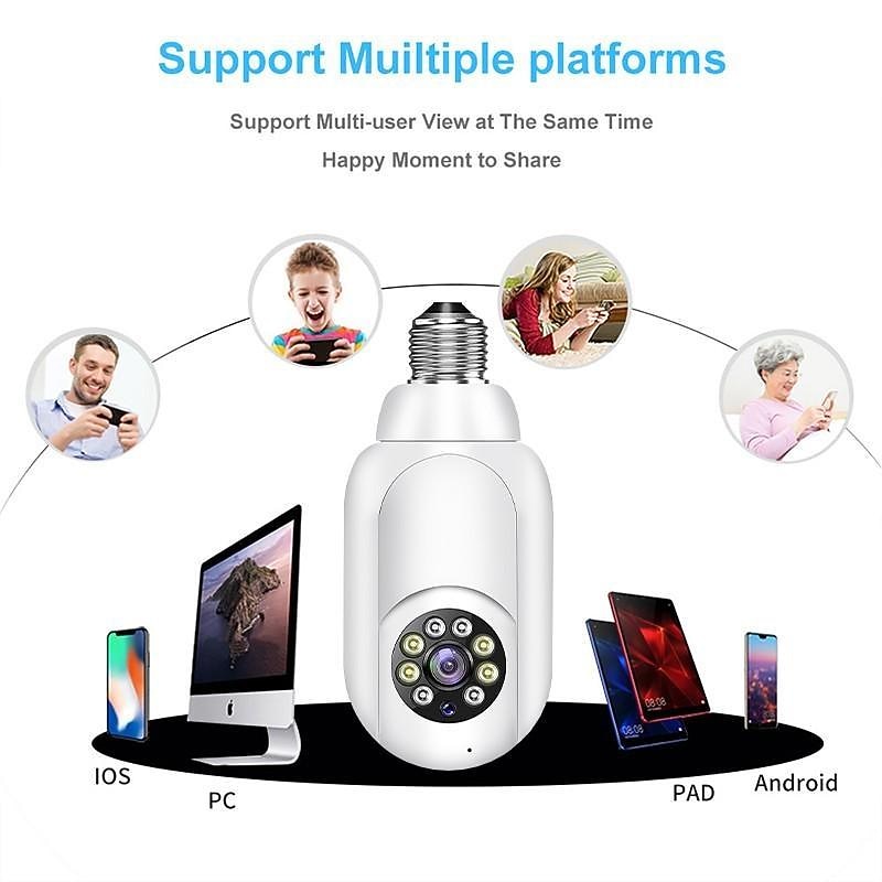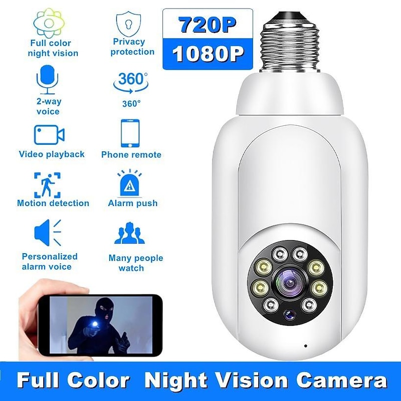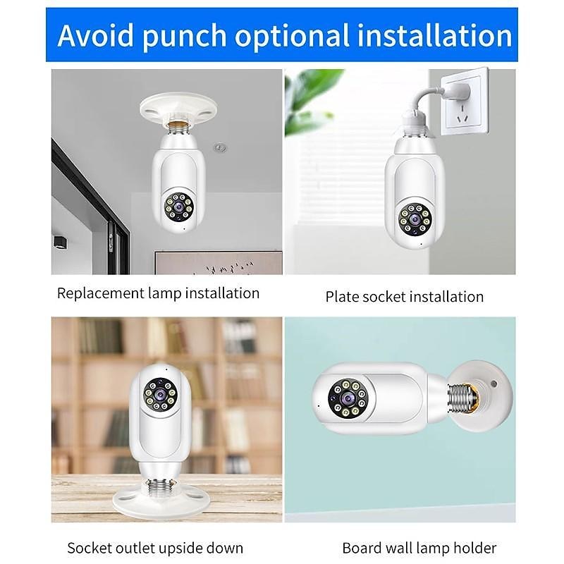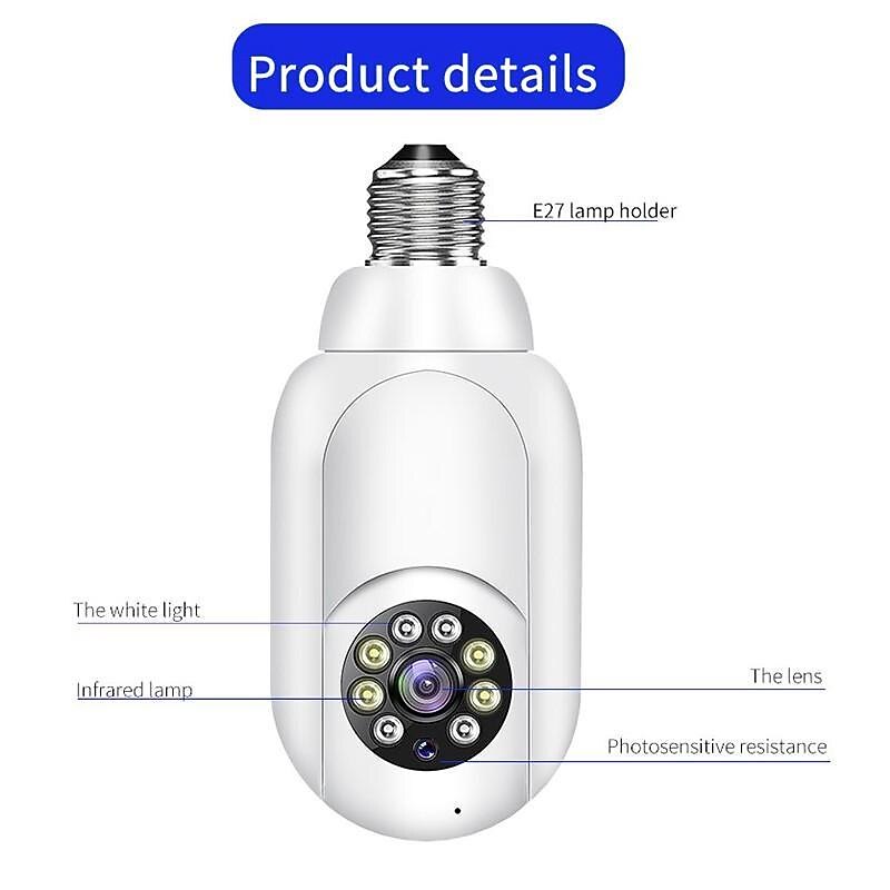 Highlights Product Selling Points: - Wireless and Easy to Install: Comes with an E27 bulb base for easy mounting. Simply download the mobile app and connect the camera to WIFI using the app. No additional steps required. Supports 2.4Ghz WiFi only (does not support 5Ghz WiFi). No included TF card in the package, but supports a maximum 128GTF card. - 720/1080P & Smart Night Vision: Provides a clear picture, even at night. Offers both normal night vision and color night vision. Control the camera's viewing angle through the app for a 360-degree viewing experience without any blind spots. - Motion Detection & Real-Time Alerts: Equipped with a high-sensitivity chip motion sensor. When a moving object is detected, it will record the movement and send notifications to the app. - Remote Viewing: Share simultaneous access with family, friends, and other devices. Features 4pcs infrared LEDs and 4pcs white LEDs for normal and color night vision options. - High-Quality Components: Features a processor AK3918E V200 and an image sensor 1/4" HD CMOS 2 million pixel CMOS sensor (GC1054). Supports MP4 (720/1080P) manual video format and H.264 video compression standard. Offers maximum 25 frames per second video frame rate. Supports both local and cloud storage. Supports multiple protocols including HTTP, HTTPS, TCP, IPV4, UDP, ICMP, DHCP, DNS, and QoS. Supports IEEE 802.11b/g/n WiFi. Equipped with a 3.6MM built-in lens. Offers PTZ control with horizontal rotation of 355° and vertical rotation of 95°. Supports motion detection. Recording modes include continuous recording and event recording. Supports mobile client push for alarm actions. Can be remotely upgraded through the network. Supports multi-user sharing with up to 20 family shares. Works with a 5V1A power supply. Suitable for indoor use. Compact stand-alone size of 68*69*156MM and lightweight design of 190.5g. - Convenient Packaging: Comes with a camera, screw bag, lamp holder, and user manual.