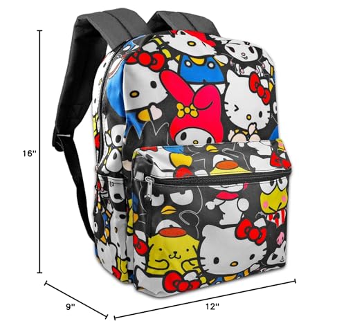 • This Hello Kitty school backpack features adjustable shoulder straps, a zip closure compartment, and a top loop for hanging featuring the colorful artwork of Hello Kitty, Kuromi, Pompompurin, and more friends. The Hello Kitty backpack measures approximately 16" x 12" x 5".