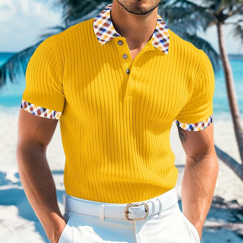 More information about Men's Rib Knit Top Muscle Shirt Work Casual Lapel Ribbed Polo Collar Short Sleeve Basic Modern Color Block Buttons Knitted Summer Spring & Summer Slim Fit White Yellow Navy Blue Light Blue Rib Knit