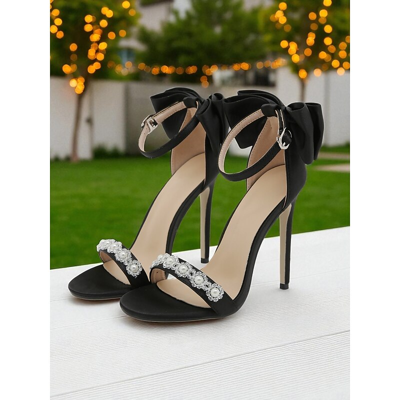 HOT ! Women's Pink Satin Stiletto Heel Sandals with Pearl-Embellished Toe Strap and Bow Accent, Elegant Open Toe Shoes for Cocktail Parties