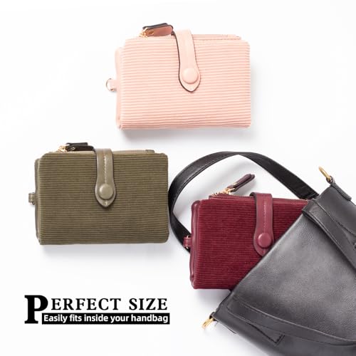 Womens Trifold Leather wallet Rfid blocking Ladies Wristlet with Card holder id window Coin Purse for Women,Corduroy Trifold Wallet Clutch(Dark Green) 5