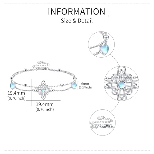 Material: Sterling SilverMetal type: Sterling SilverClasp type: BuckleChain type: Extendable ChainGem type: No gemstoneDesign:This exquisite 925 sterling silver witch knot bracelet, with a charming love moonstone, shows a mysterious and unique charm. Not only is it unique in design, it also incorporates the symbolism of the witch knot, allowing you to exude a mysterious and charming atmosphere. It is a fashionable choice to show personality and magic.Material: Witches knot bracelet, made of first-class 925 sterling silver with moonstone. It is no lead, no nickel, hypoallergenic and highly polished. It is suitable for long-term wear and does not contain any allergic ingredients.Size:The witches knot bracelet size is 0.76*0.76 inch,silver chain length 7+2 inches(Adjustable). Packaging:1 x witches knot bracelet ; 1 x polishing cloth and 1 x exquisite jewelry box.Occasion: The witches knot bracelet will come with a charming jewelry box, a unique jewelry for women, mothers, wives, grandmothers, sisters, friends or yourself, suitable for Birthday, Congratulation, Graduation, Mother's Day, Anniversary, Valentine's Day, Thanksgiving, Christmas, etc.HBLICY Service: HBLICY is committed to providing unique, high-quality jewelry. If you need any help, please feel free to contact us, we will respond within 24 hours to ensure you have a pleasant shopping experience Perfect for everyday use. High quality materials and excellent craftsmanship ensure long-lasting durability.