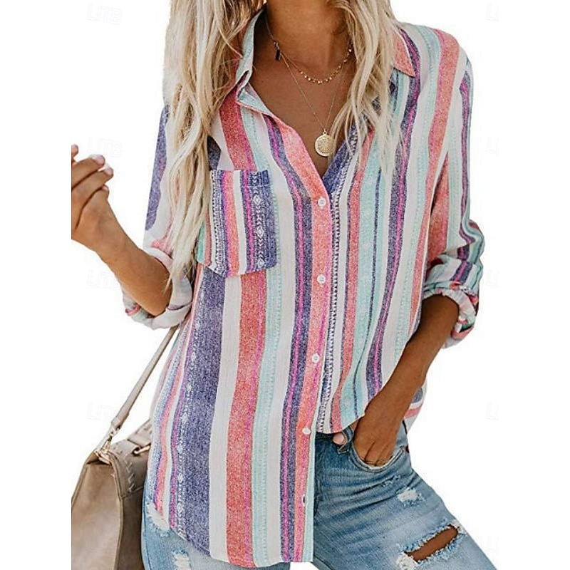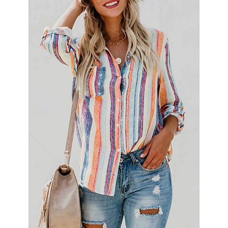 HOT ! Women's Shirt Button Down Blouse Striped Stylish Casual Long Sleeve Shirt Button Down Blouse Collar Regular Tops Daily Buttons Print Pink Blue Orange Green Rose Pink Summer Spring