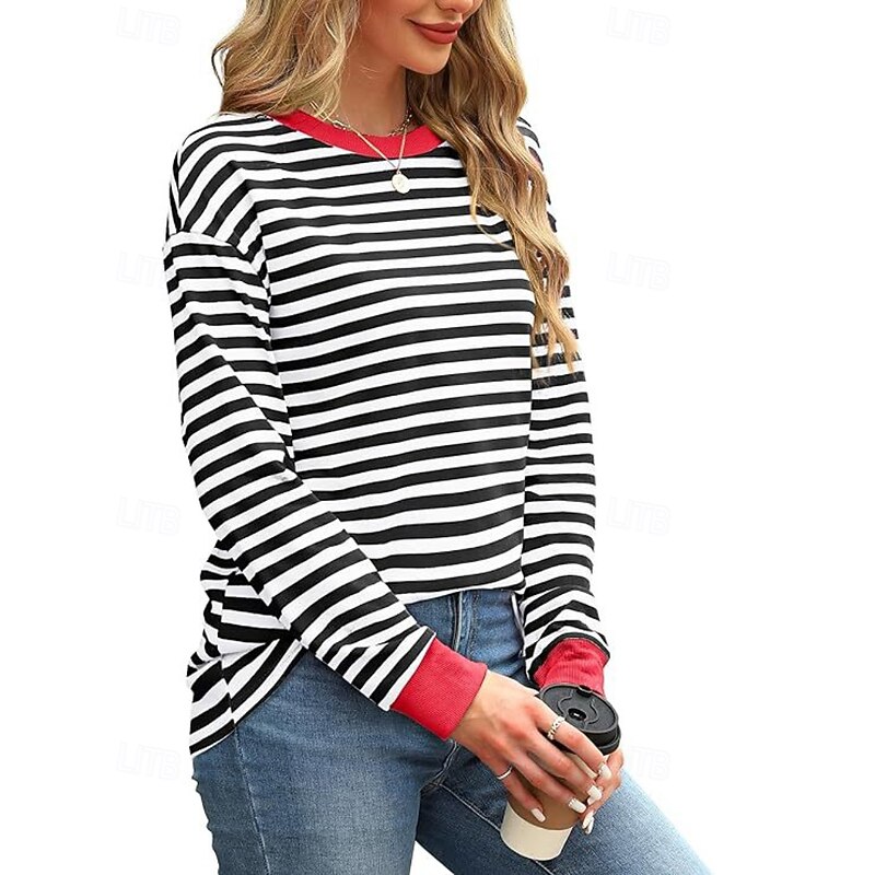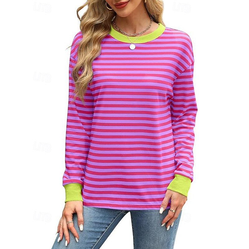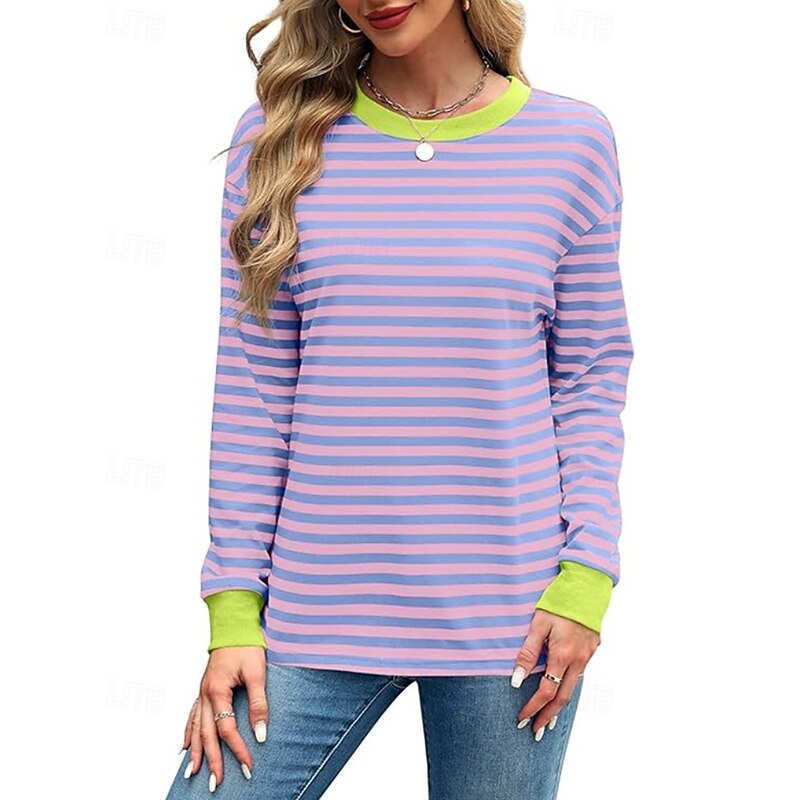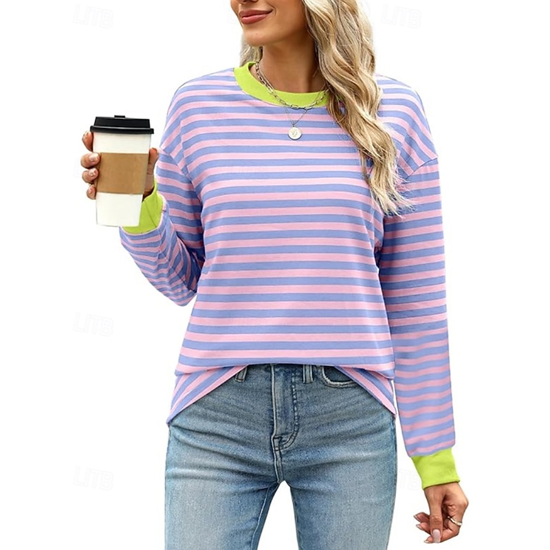 Women's Blouse Striped Modern Casual Long Sleeve Crew Neck Regular Tops Daily Going out Patchwork Blush Pink Black White Light Green Pink Summer 24