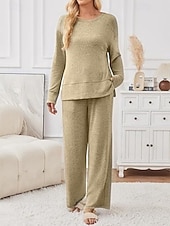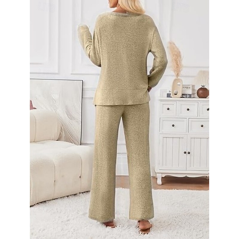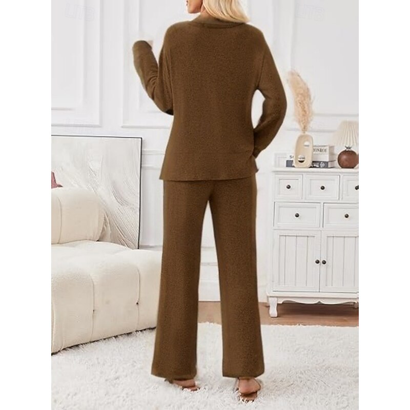 Women's Basic Pants Sets Long Sleeve Crew Neck Plain Patchwork Casual Black Brown Khaki Fall & Winter Loose Fit 14