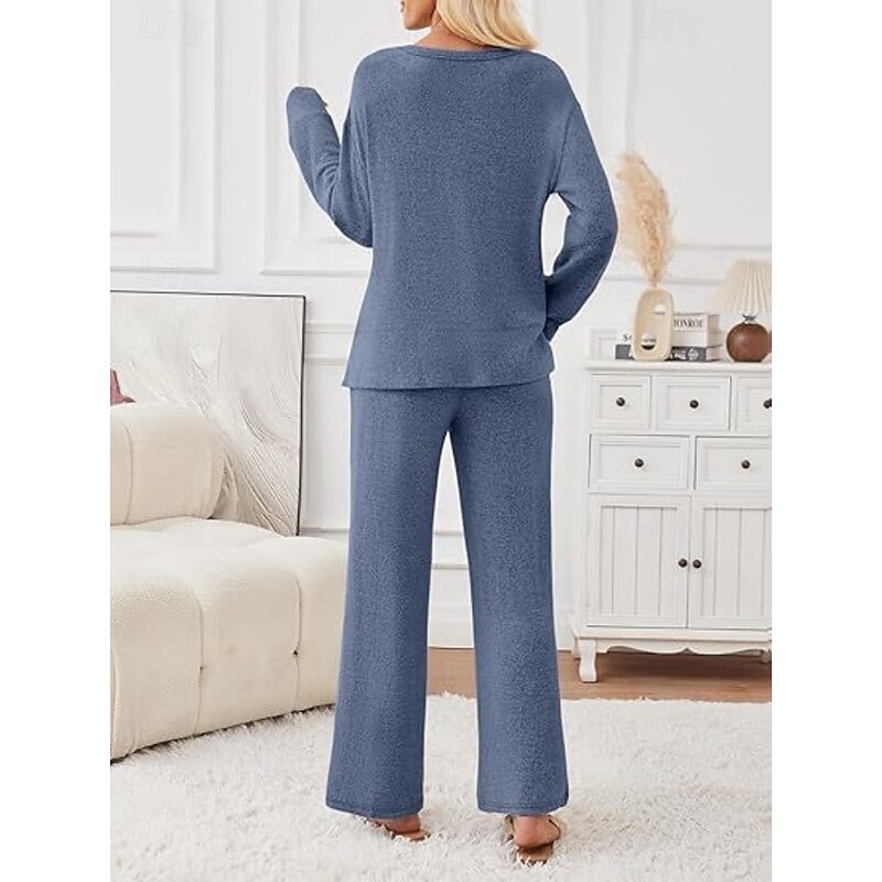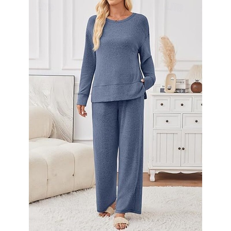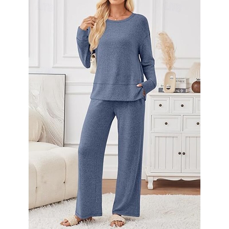 HOT ! Women's Basic Pants Sets Long Sleeve Crew Neck Plain Patchwork Casual Black Brown Khaki Fall & Winter Loose Fit