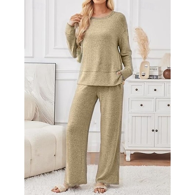 Women's Basic Pants Sets Long Sleeve Crew Neck Plain Patchwork Casual Black Brown Khaki Fall & Winter Loose Fit 7