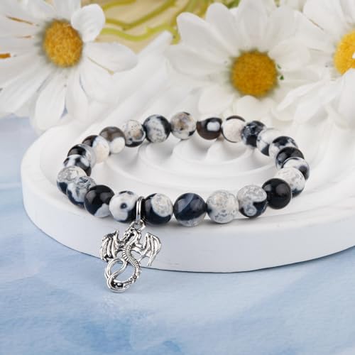 • Perfect Size – The dragon pendant elegantly dangles from the bracelet, which features 8mm round beads and measures approximately 7 inches. Crafted with a high-quality elastic cord, it offers a secure and adjustable fit for most wrists, with neatly hidden knots for a polished appearance.