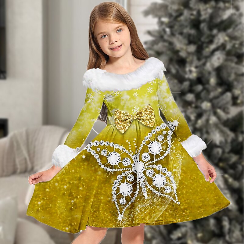 Kids Girls' Dress Snowflake Dress Animal Butterfly Long Sleeve Casual Fur Trim Crewneck Adorable Daily Polyester Above Knee Casual Dress Swing Dress A Line Dress Fall Winter 3-10 Years Yellow Red