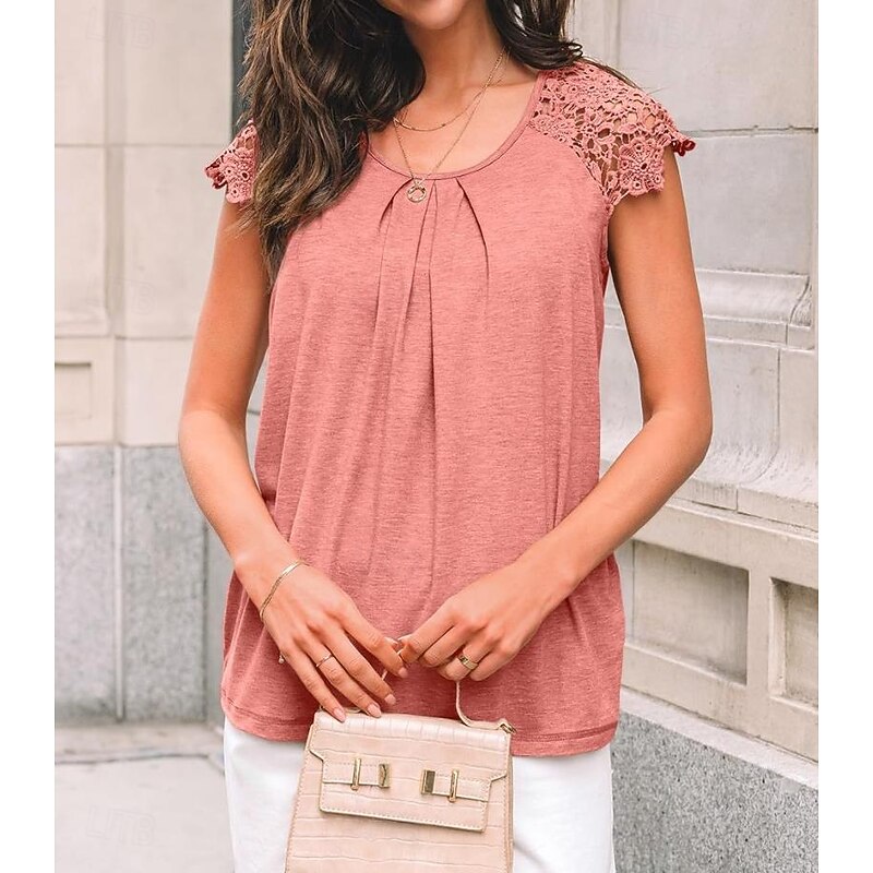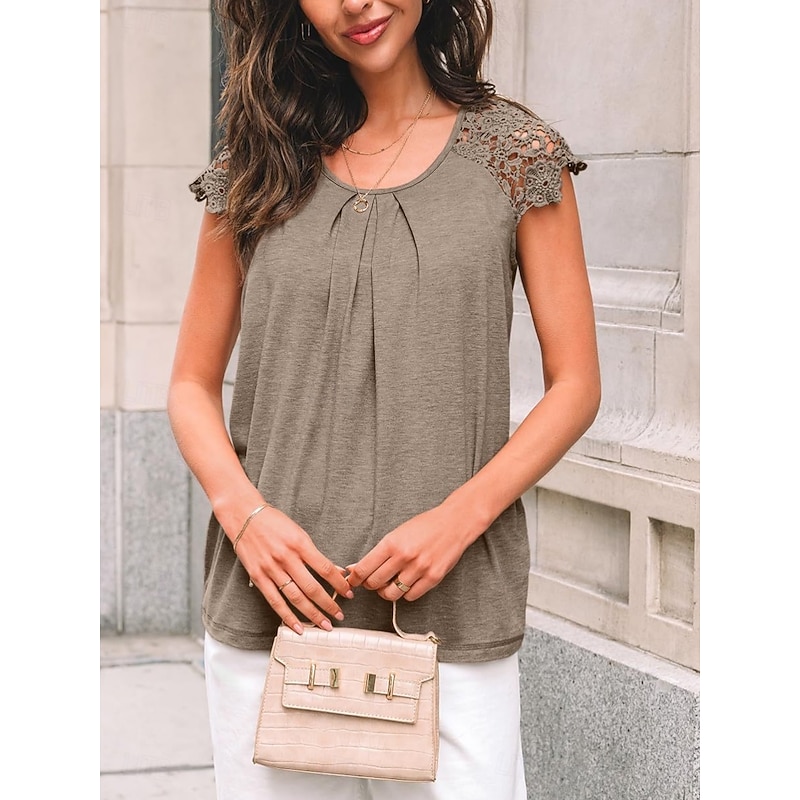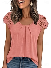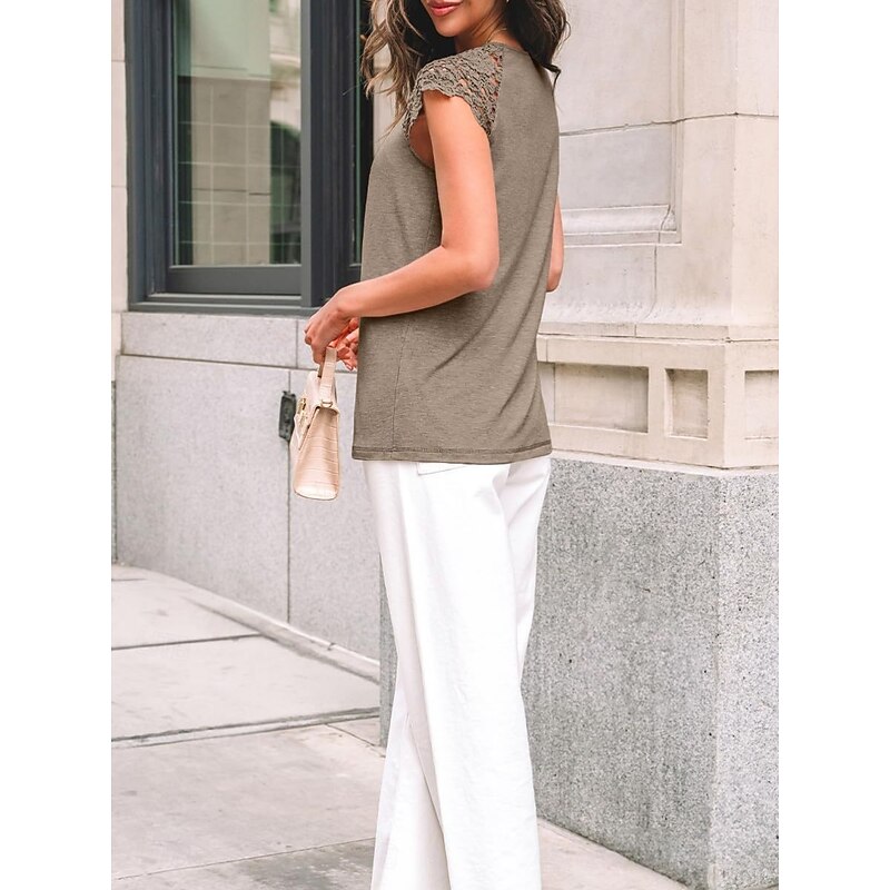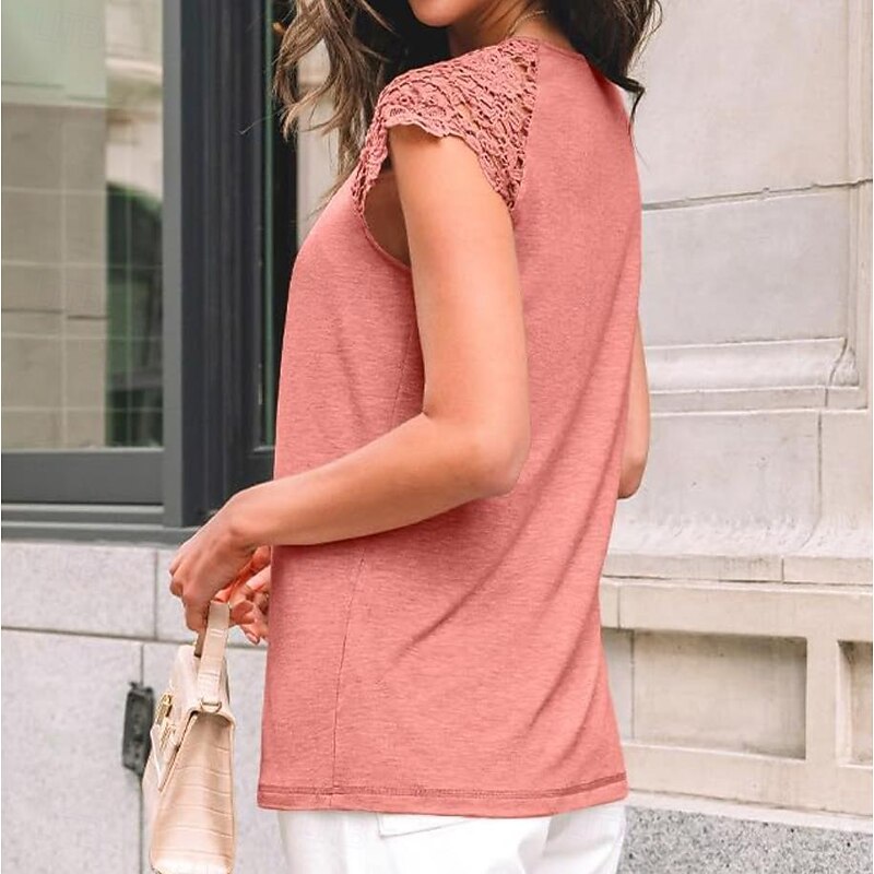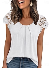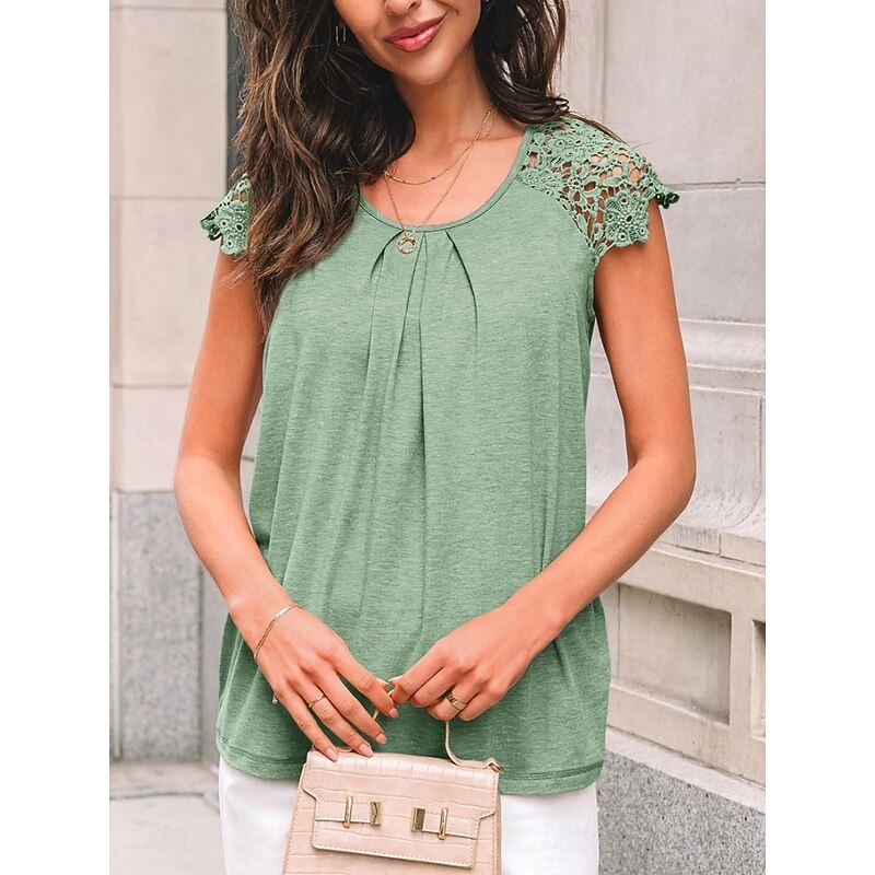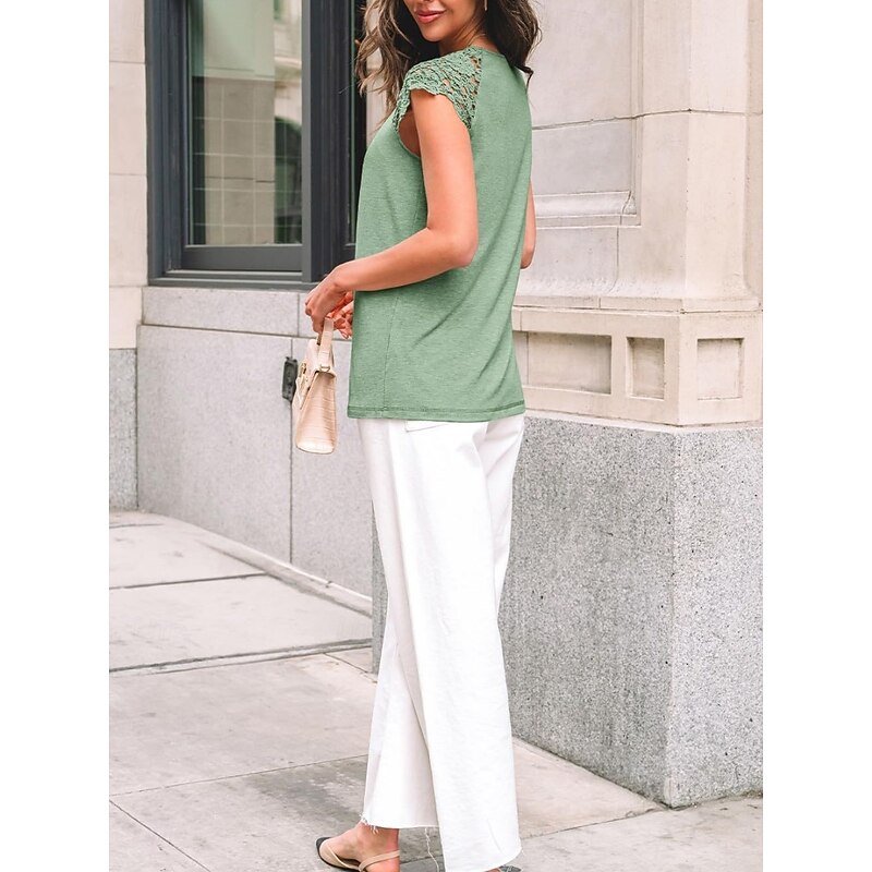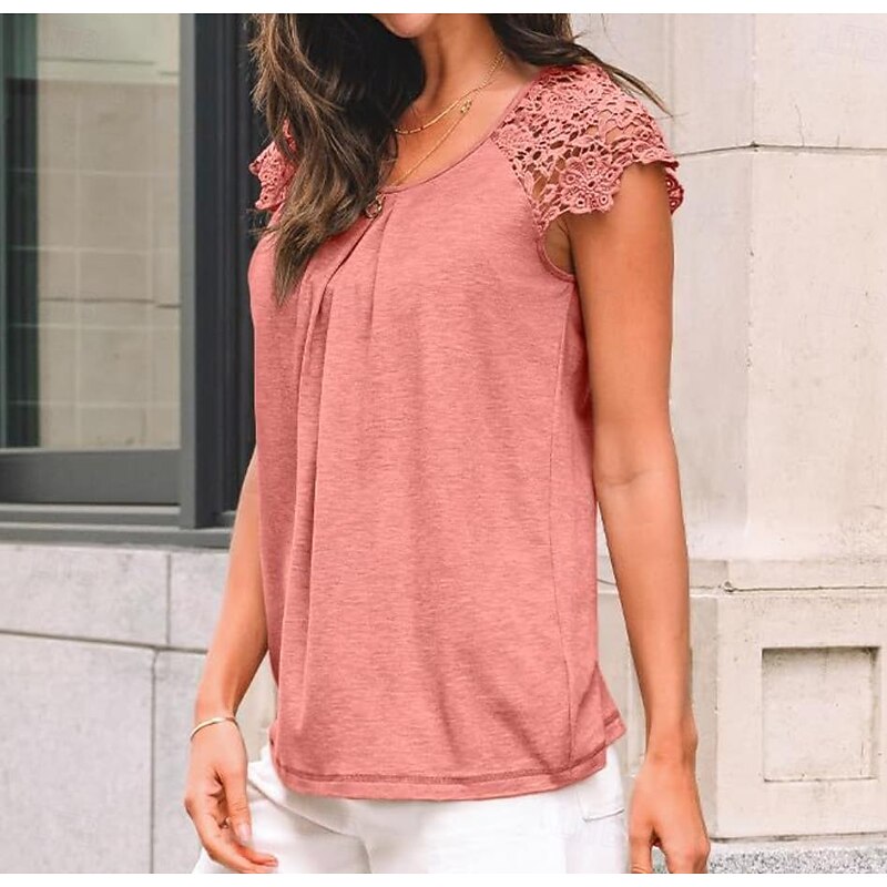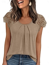 More information about Women's T Shirt Solid Color Plain Fashion Stylish Classic Short Sleeve Crew Neck Regular Tops Daily Weekend Lace Patchwork Black Blue Green Khaki Summer