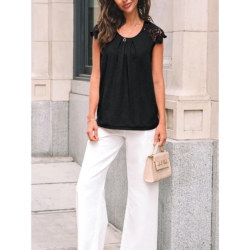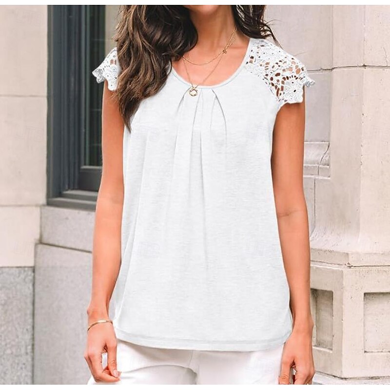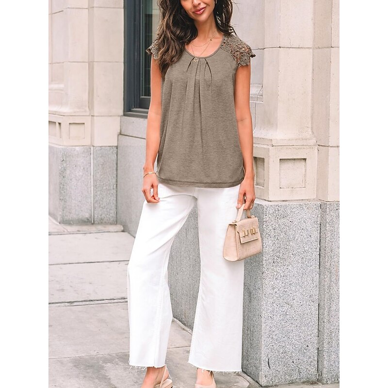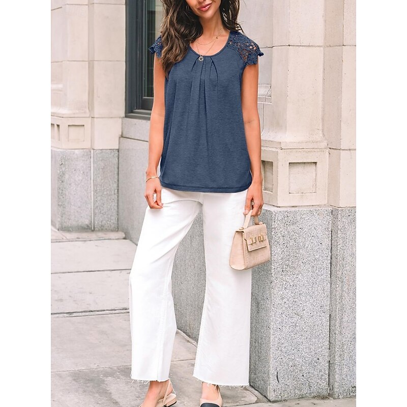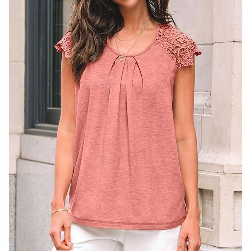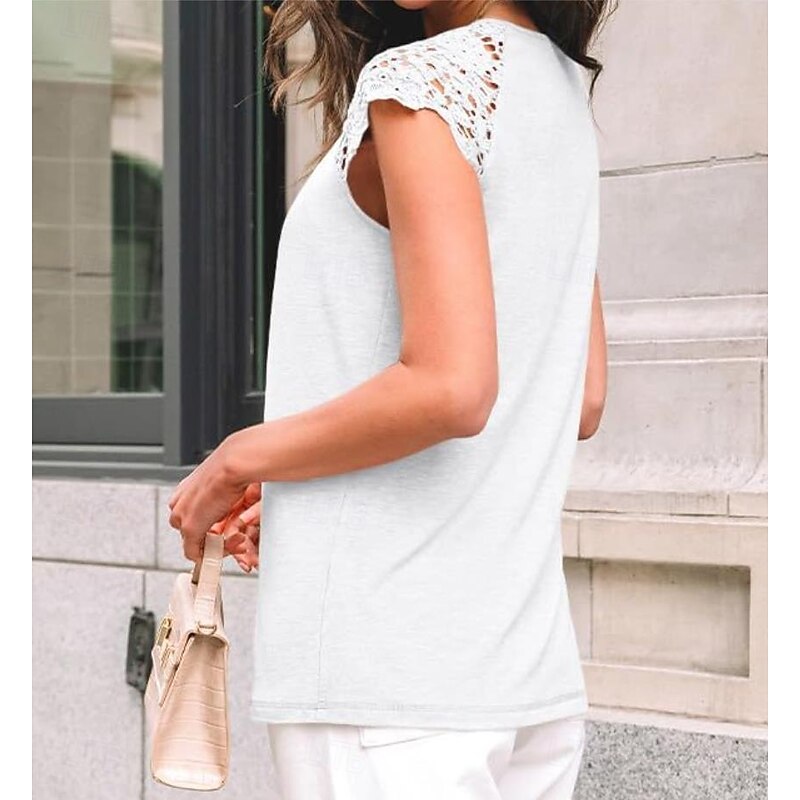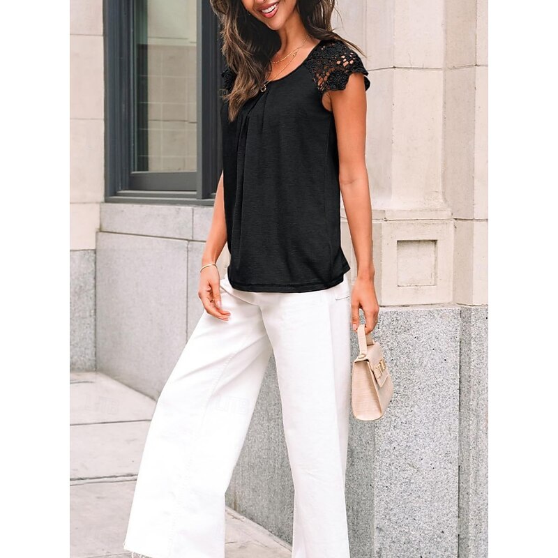 More information about Women's T Shirt Solid Color Plain Fashion Stylish Classic Short Sleeve Crew Neck Regular Tops Daily Weekend Lace Patchwork Black Blue Green Khaki Summer