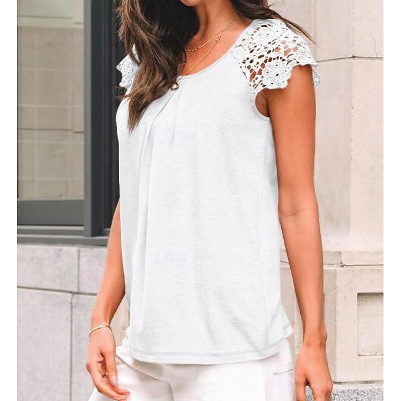 HOT ! Women's T Shirt Solid Color Plain Fashion Stylish Classic Short Sleeve Crew Neck Regular Tops Daily Weekend Lace Patchwork Black Blue Green Khaki Summer