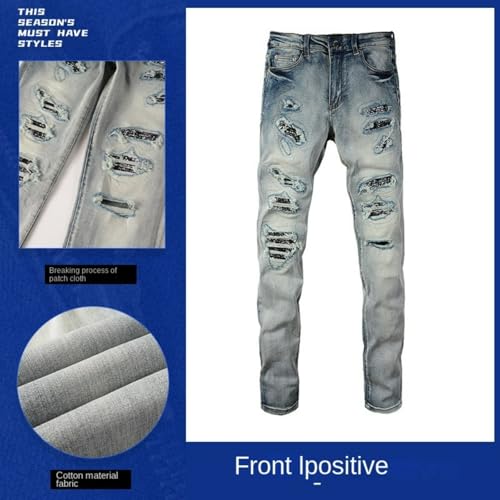 HOT ! Jeans Pants Trousers Denim Men Perforated Elastic Slim Fit Worn Hole with Zircon Sequins Street Trendy Blue Sanding Fading Fringed Casual Small Leg(Light Blue,29)