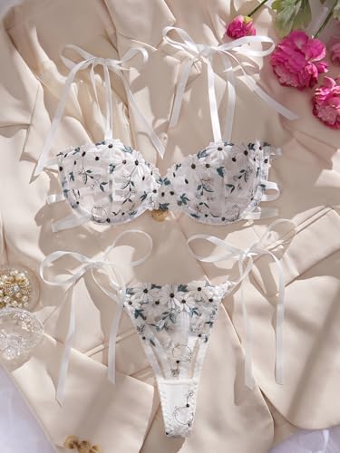 More information about Lilosy Sexy Tie Side Embroidered Underwire Push Up Cute Strappy Mesh Sheer Bachelorette Lingerie Set