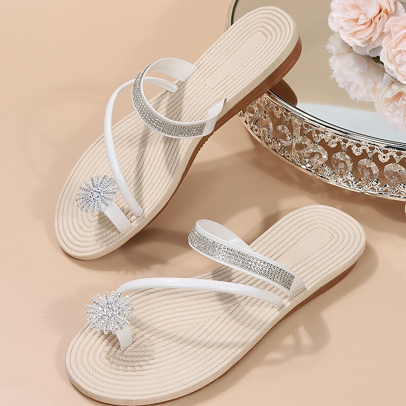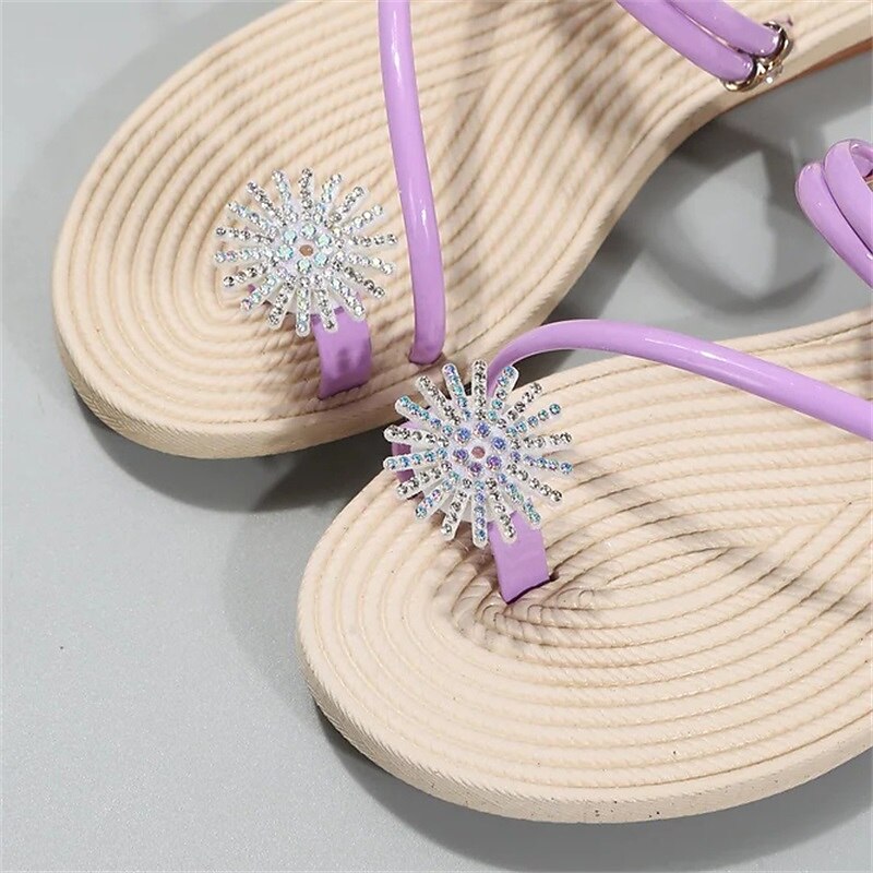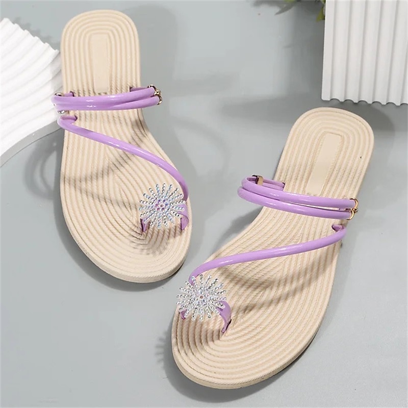Highlights [Fabric] : These Women's Strappy Sandals feature high-quality faux leather uppers, embellished with dazzling rhinestones. The combination of PU and thermoplastic rubber (TPR) in the outsole materials ensures durability while providing a comfortable fit. [Fit] : Designed with a flat heel of less than 1 inch, the sandal offers a minimalistic style that caters to both fashion and comfort. The open-toe loafer closure allows for easy wearing and a relaxed fit, making them perfect for summer. [Design Highlights] : The sandals boast intricate decorative elements, such as sparkling rhinestones on the straps, that enhance their elegance and style. The opulent gold trim that wraps around the foot adds to their luxurious appearance, making these sandals a standout accessory for any summer outfit. [Occasions] : Ideal for outdoor adventures, beach visits, or casual outings, these sandals seamlessly blend style and comfort. Whether you're on a vacation or enjoying a casual day out, these versatile sandals complement a wide range of occasions, from relaxed beach walks to stylish evening get-togethers. [Sizes] : Available in a variety of sizes, these sandals accommodate a range of foot sizes, including US5.5 to US10.5. The diverse sizing ensures a perfect fit for many women, enhancing comfort and wearability.