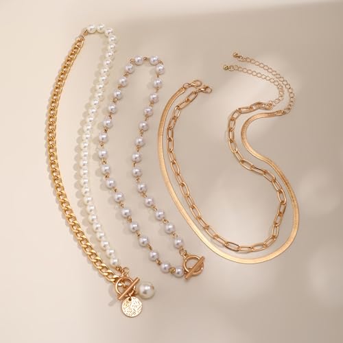 Gold Layered Chunky Necklace for Women Paperclip Chain Pearl Necklace Herringbone Necklace Gold Chunky Necklaces 3