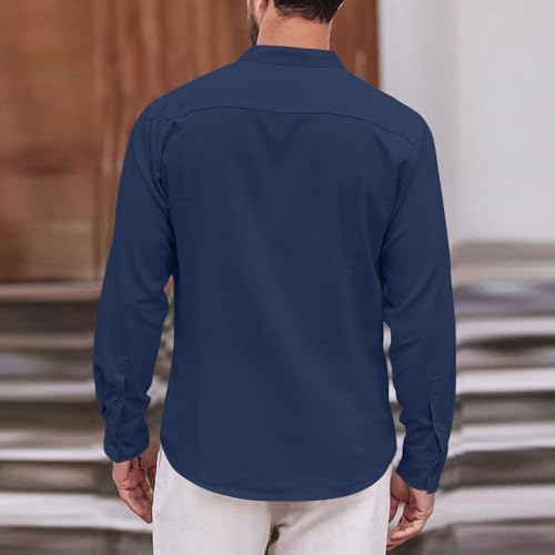 Mens Cotton Linen Shirt Long Sleeve Mandarin Collar Button Down Shirt Lightweight Breathable Beach Tops