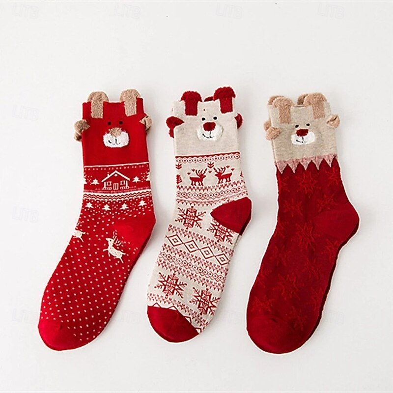 3 Pairs Christmas Cartoon Jacquard Cotton Women's Socks Reindeer Santa Red Mid Calf 3D Design Adult Holiday Gift Box Set Festive Winter Warm Sock Accessory 3