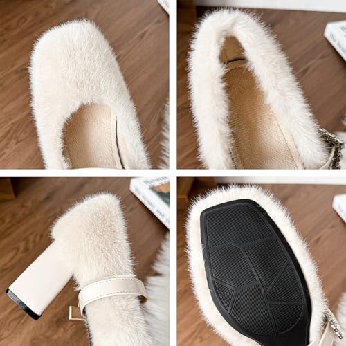 Fuzzy Mary Jane Heels for Women Chunky Heels Square Toe Pumps with Buckle Strap Block Heel Winter Kawaii Heels 6