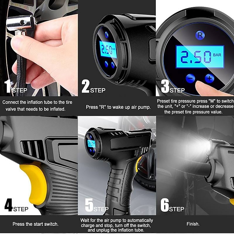 Highlights 1. Portable air pump with bright LED lights for easy operation in the dark and to ensure visibility in emergency situations. 2. Keeps tires at correct pressure for safe driving and improved fuel efficiency. 3. Perfect for roadside emergencies and unexpected flat tires in the field or early morning commutes. 4. Versatile inflator for cars, bikes, motorcycles, SUVs, ATVs, and trucks with additional adapters for sports equipment and inflatables. Specification: - Made with durable ABS material - 10A current and 120W power - Voltage options of 7.4V or DC 12V - Quick inflation efficiency of 27L/min - 2000mAh battery capacity - Includes lighting and automatic charge stop functions - Comes with a 3-meter-long cord - Measures 132*53*203mm and available in various colors. Package contents: - Wired version includes Air Compressor, Air Hose, Ball Needle, and Toy Nozzle. - Wireless version has additional USB charging cable and storage box. Note: - Please allow slight differences in size and color due to manual measurement and screen settings.