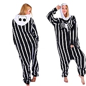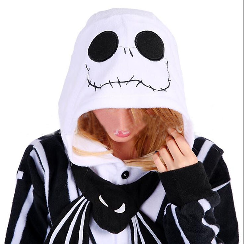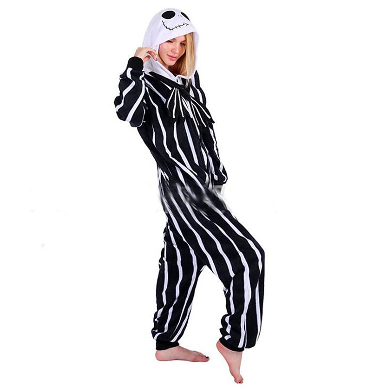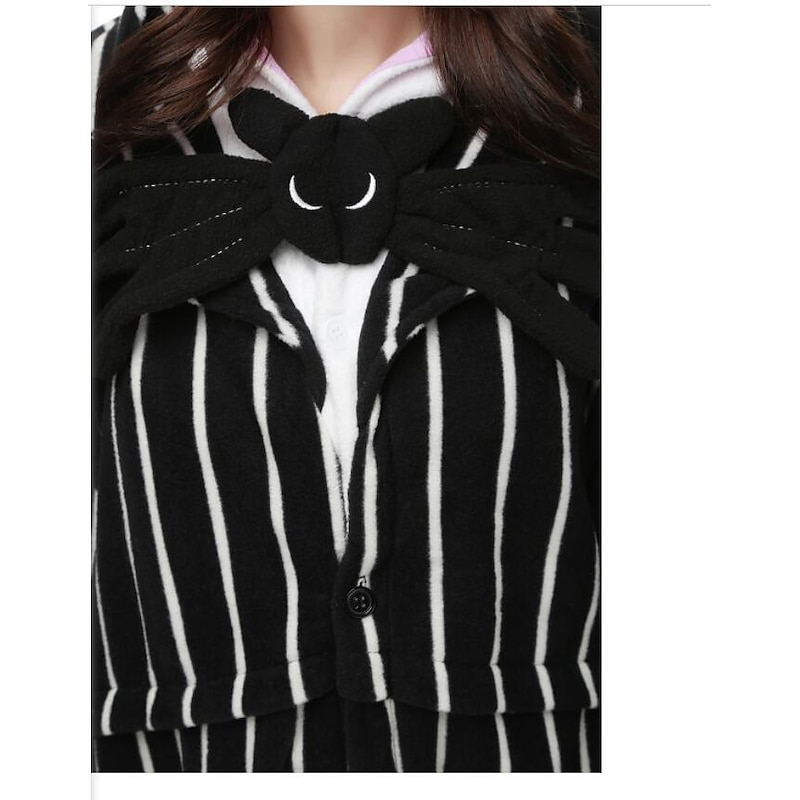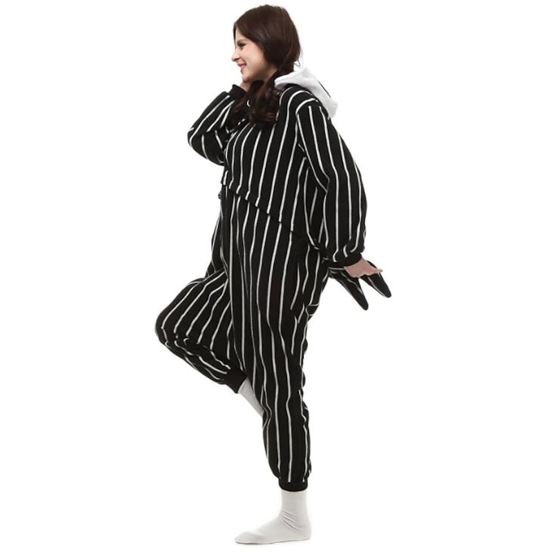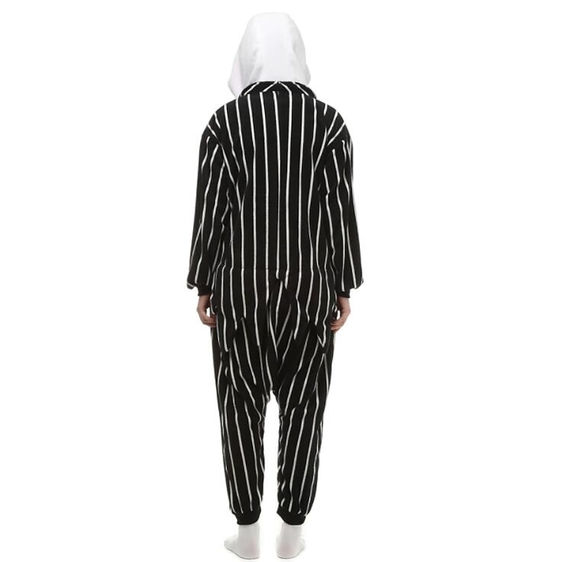 : The bold black and white vertical stripes create a classic and eye-catching appeal, while the hood, complete with whimsical character details, adds to the fun, playful aesthetic. Ideal for cosplay enthusiasts, the onesie captures the essence of beloved characters with its detailed design.