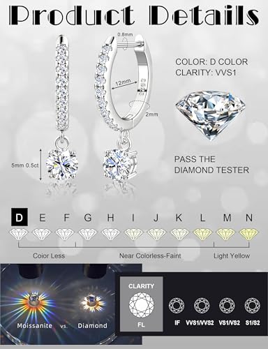 More information about Moissanite Earrings, Sterling Silver Hoop Earring 1.0ct-2.0ct D Color Brilliant Hypoallergenic Earring for Women Men Drop Dangle Moissanite Leverback Mother's Day Gift