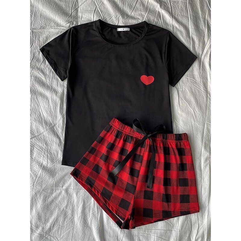 Women's Pajamas Sets Heart Grid / Plaid Fashion Comfort Home Daily Bed Breathable Crew Neck Short Sleeve T shirt Tee Shorts Elastic Waist Summer Spring Home Outfits 6