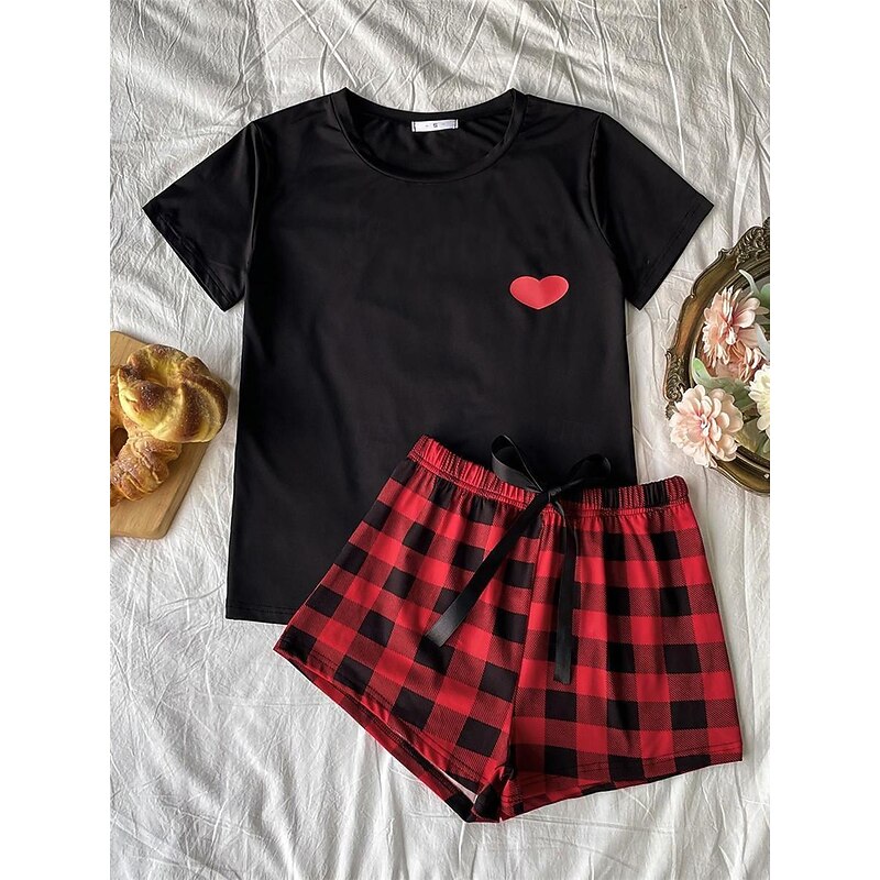 Women's Pajamas Sets Heart Grid / Plaid Fashion Comfort Home Daily Bed Breathable Crew Neck Short Sleeve T shirt Tee Shorts Elastic Waist Summer Spring Home Outfits 1